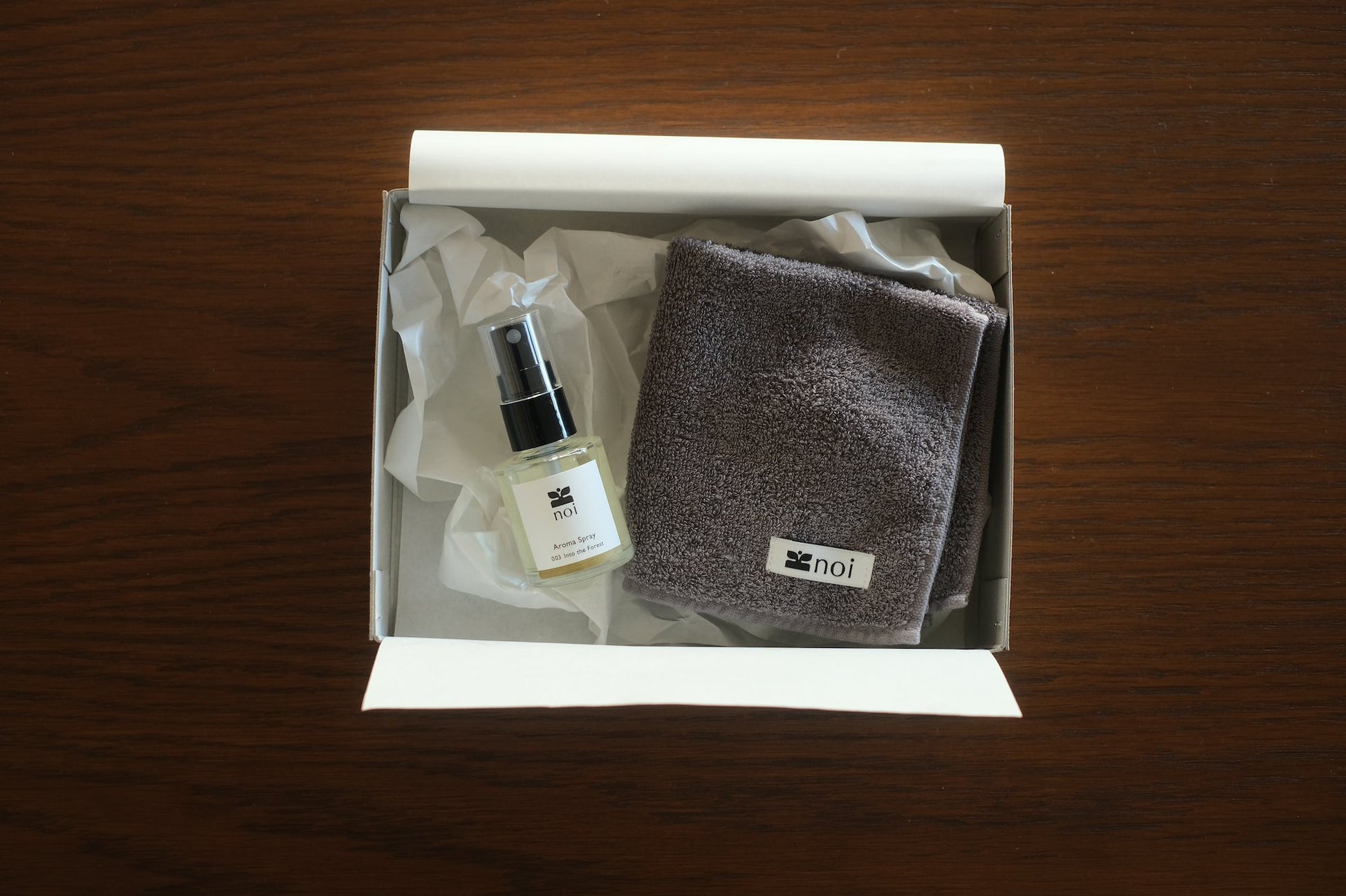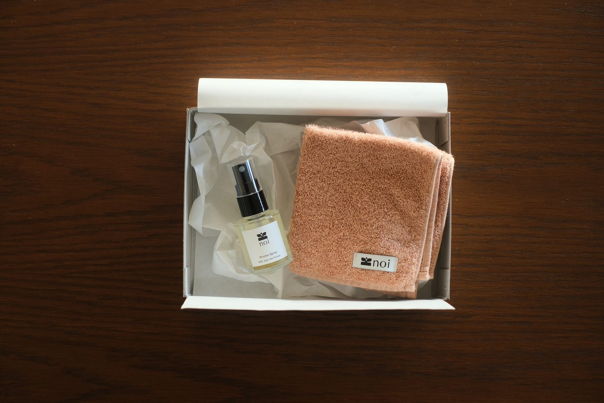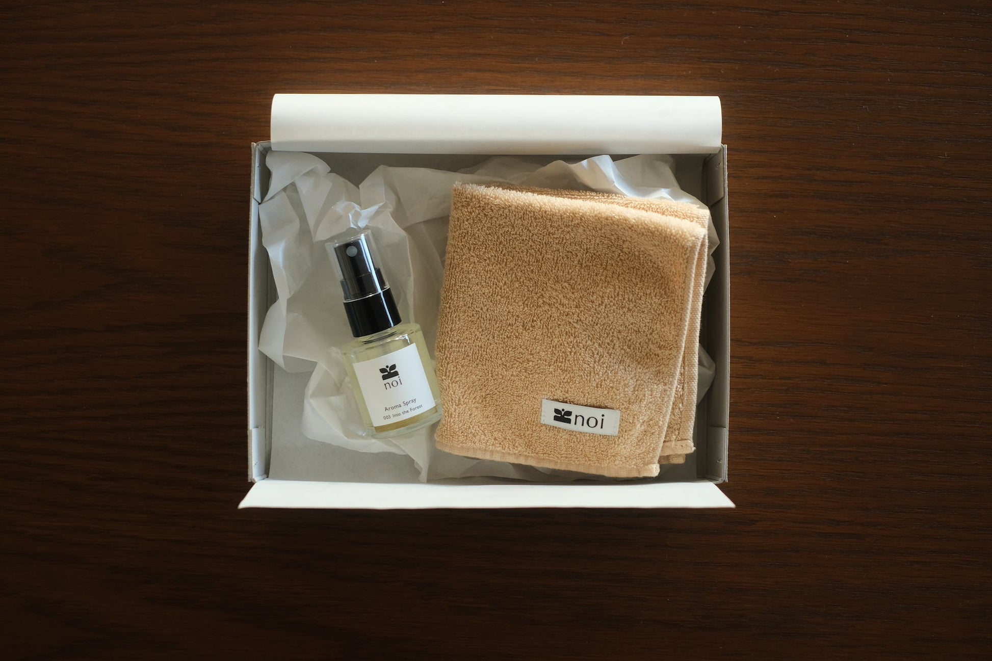 ボックスの中には、「アロマスプレー 003 Into the Forest」と「草木染めのオーガニックハンドタオル」が入ってます。