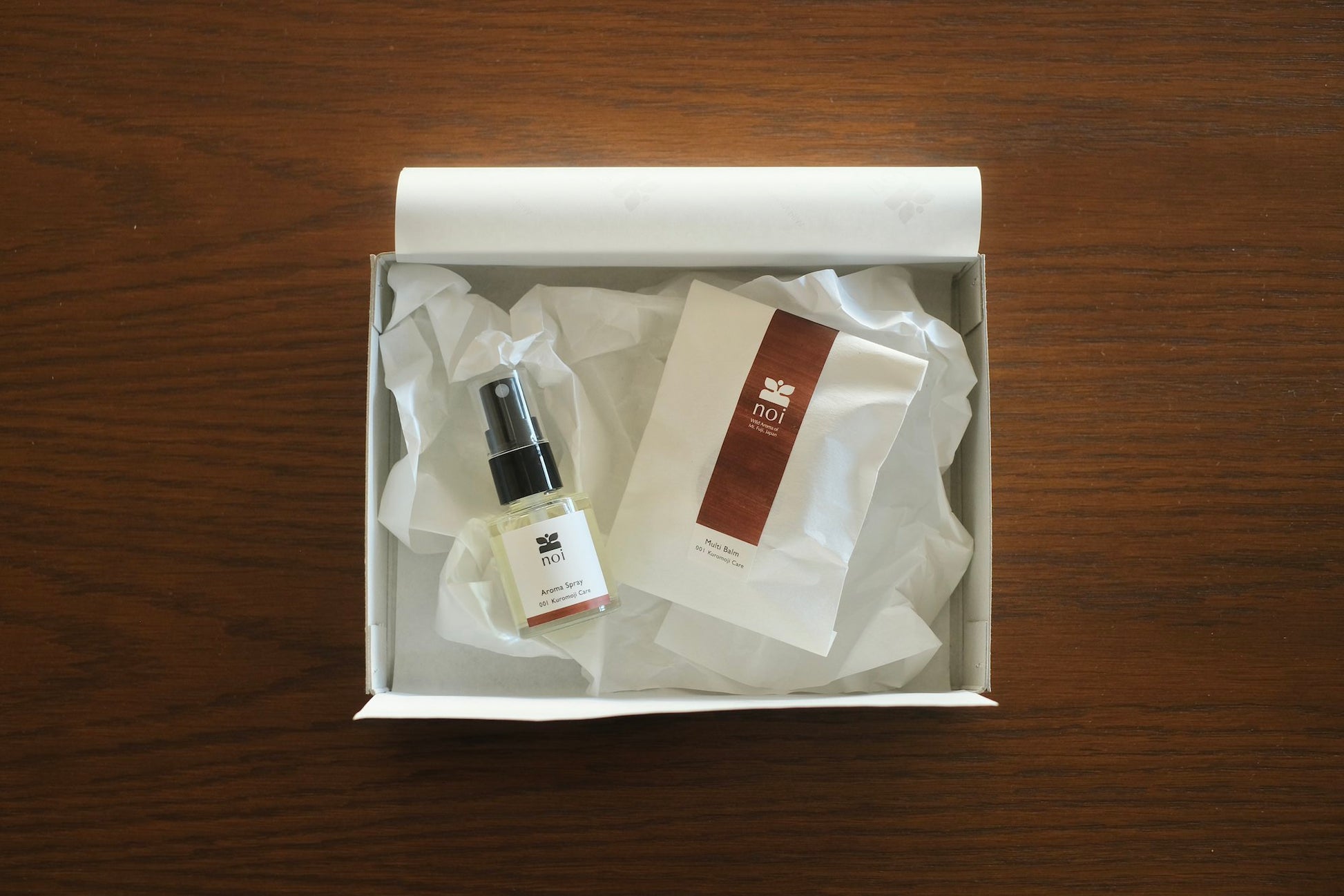 そんな Kuromoji Care のファンの方のためのギフトボックスです。ボックスの中には、「アロマスプレー 001 Kuromoji Care」と「クロモジマルチバーム 001 Kuromoji Care」が入ってます。