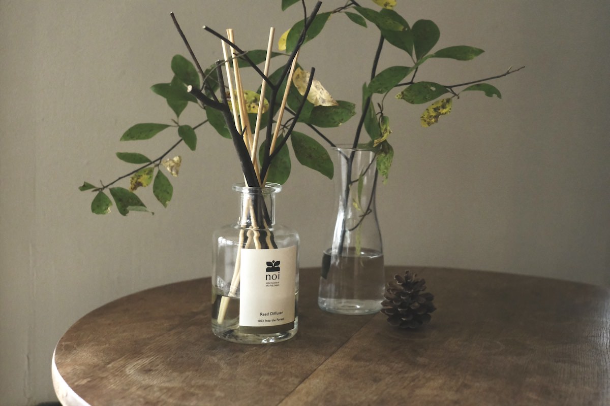 人工香料が使われることが多いディフューザーですが、noiのディフューザーは天然精油のみをブレンドしてつくっているため、ツンとした香りが少なく、天然の爽やかな柑橘や植物の香りが優しく広がります。